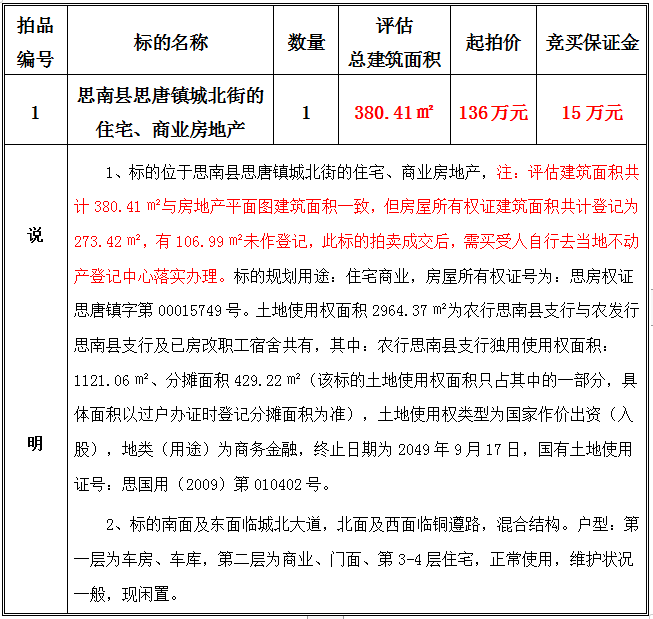 1、思南縣思唐鎮(zhèn)城北街的住宅、商業(yè)房地產(chǎn),建筑面積共:380.41㎡;起拍價(jià):136萬(wàn)元;競(jìng)買保證金15萬(wàn)元。