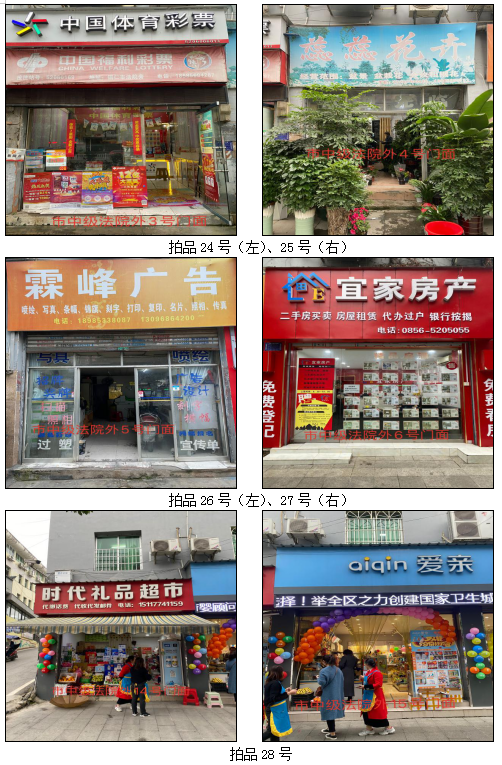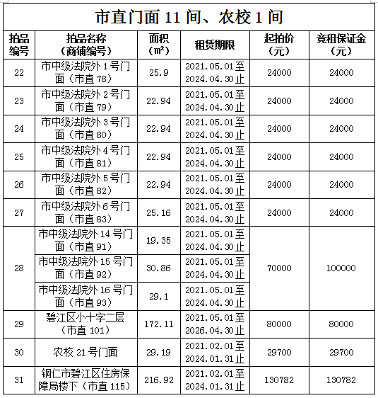 1.拍品22至28號(hào)標(biāo)的位于銅仁市中級(jí)人民法院外,面積:19.35——30.86㎡,租賃期3年(2021.05.01至2024.04.30止),交通便利,其中28號(hào)標(biāo)的包含3個(gè)門(mén)面(市直91號(hào)、92號(hào)和93號(hào))為整體拍租。