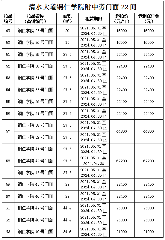1.拍品49至66號(hào)標(biāo)的位于銅仁市清水大道銅仁學(xué)院附中旁,面積15——44.4㎡,租賃期3年(2021.05.01至2024.04.30止),交通便利,人流量大。