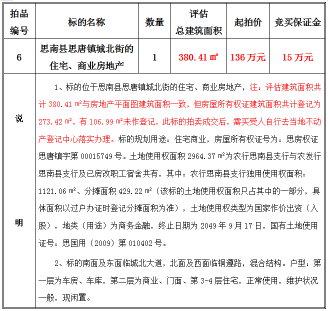 2、思南縣思唐鎮(zhèn)城北街的住宅、商業(yè)房地產,建筑面積共:380.41㎡;起拍價:136萬元;競買保證金15萬元。