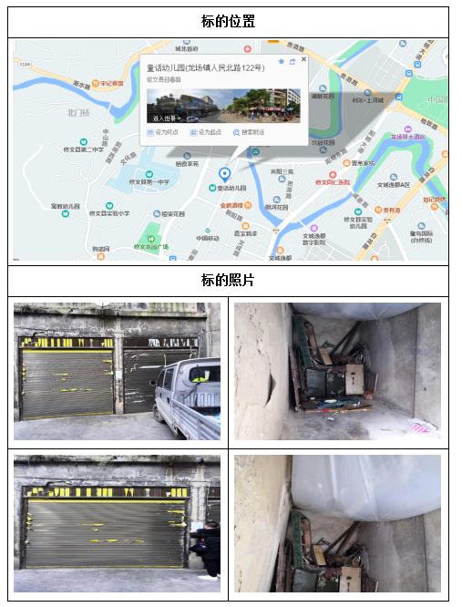 標的位于修文縣龍場鎮(zhèn)迎春路52號,建筑面積為30㎡,共兩個獨立車庫。實際用途為車庫,該標的東至迎春路,南至小區(qū)道路,西至小區(qū)道路,北至小區(qū)道路;建筑結(jié)構(gòu)為磚混結(jié)構(gòu),層高約3米,無物業(yè)管理,戶型結(jié)構(gòu)為開間。