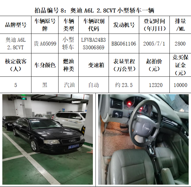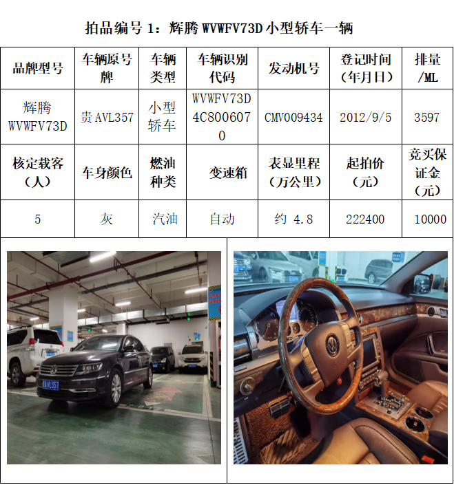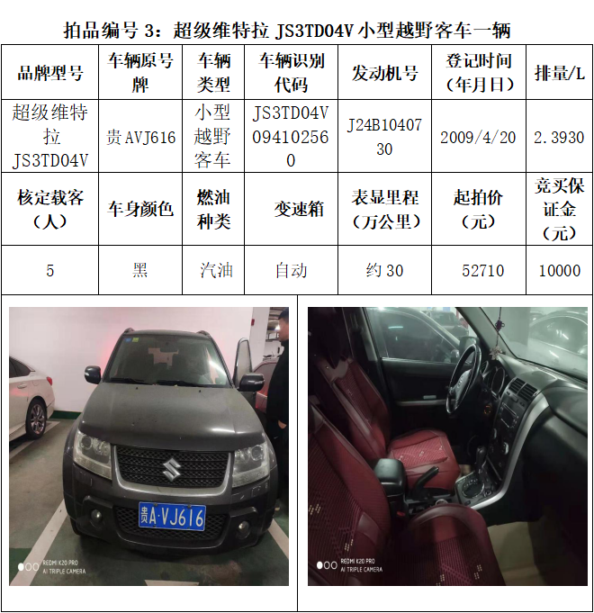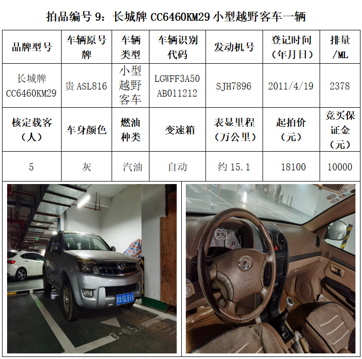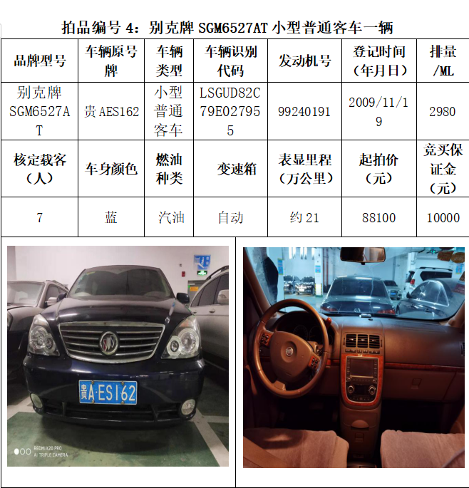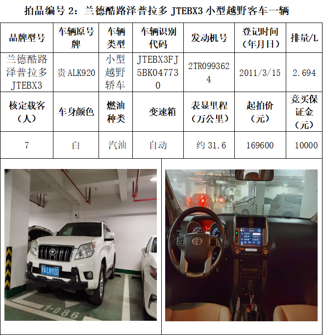 受委托,本公司定于2021年3月26日(星期五)下午14:30時(shí),在貴陽市中華南路20號(hào)新大陸數(shù)碼廣場(chǎng)10樓D座拍賣廳公開拍賣以下車輛:普拉多越野車1輛、超級(jí)維特拉越野車1輛、別克商務(wù)旅行車1輛、輝騰轎車1輛、途勝越野車1輛、雅閣轎車2輛、奧迪轎車1輛,長(zhǎng)城牌小型越野客車1輛,共計(jì)9輛車。