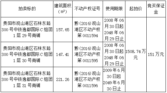 1層31號(hào)商鋪,建筑面積為221.26㎡,分?jǐn)偨ㄖ娣e為:87.66㎡,不動(dòng)產(chǎn)權(quán)證號(hào):【黔(2016)觀山湖區(qū)不動(dòng)產(chǎn)權(quán)第0011596號(hào)】,不動(dòng)產(chǎn)單元號(hào):520115 204098 GB00004 F00120004,使用期限:2009年6月30日起2049年6月30日止;