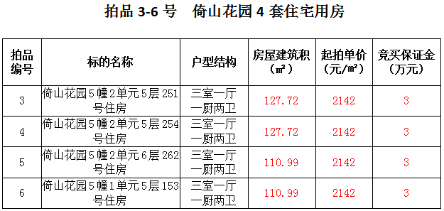 3、倚山花園4套住宅房產(chǎn),建筑面積:110.99—127.72㎡,起拍價:2142元/㎡。