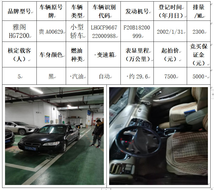 拍品編號3:雅閣HG7200小型轎車一輛