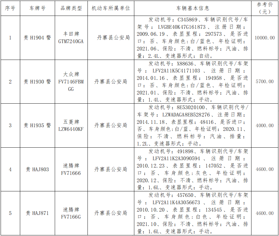 受委托,本公司于2021年9月28日(星期二)下午14∶30時(shí),在丹寨縣公安局六樓會議室,對以下標(biāo)的物按現(xiàn)狀現(xiàn)樣進(jìn)行公開拍賣。