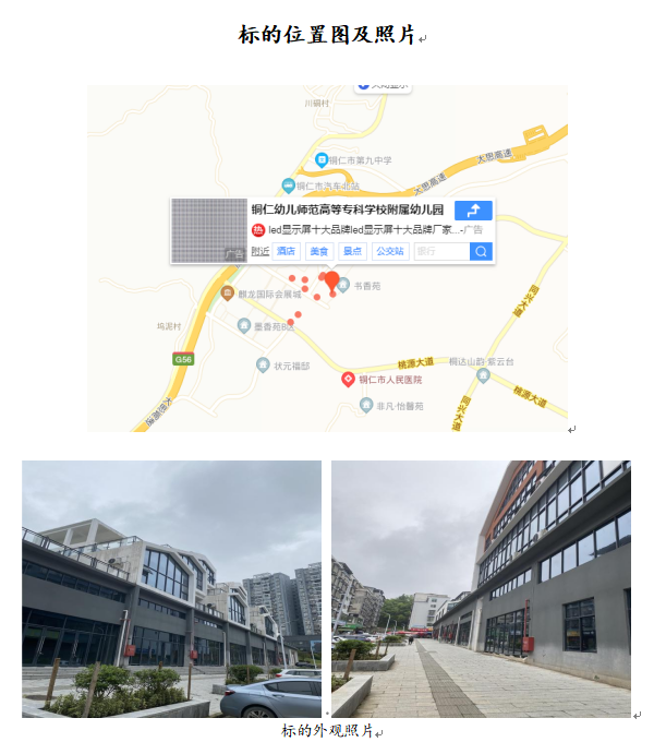 標(biāo)的位于銅仁幼兒師范高等專科學(xué)校附屬幼兒園,所在樓棟均為商業(yè)樓,房屋總層數(shù)為3層,標(biāo)的位于該樓棟的第1層,為步梯房,總建筑面積為659.82平方米,框架結(jié)構(gòu),層高約3.5米-4.5米,用途為商業(yè)用房,目前均處于空置狀態(tài),建成于2019年。