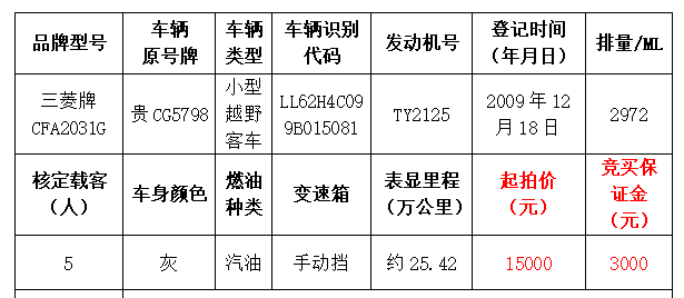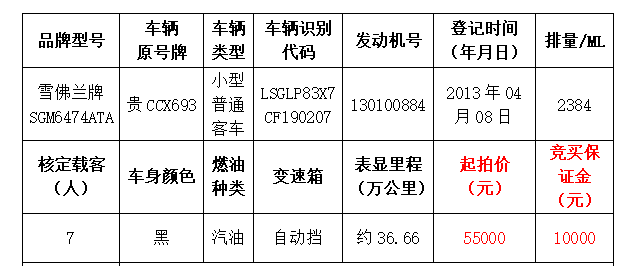 一、拍賣標(biāo)的:雪佛蘭牌SGM6474ATA小型普通客車2輛、豐田牌GTM7200GBNAVI小型轎車1輛、昊銳牌SVW7189BJD小型轎車1輛、三菱牌CFA2031G小型越野客車1輛、帕薩特牌SVW7203FPI小型轎車1輛,共六輛。
