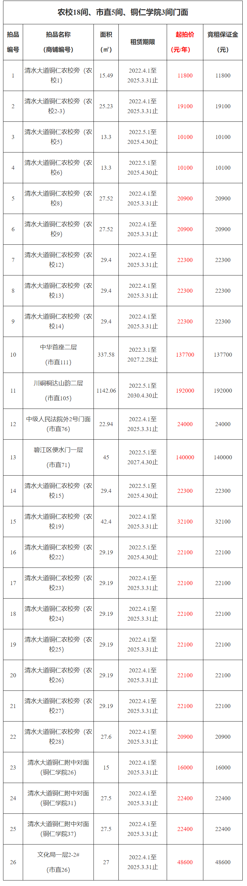 1、清水大道銅仁農(nóng)校旁(商鋪編號:農(nóng)校1),面積:15.49㎡,租賃期:3年,起拍價:11800元/年,競租保證金:11800元;