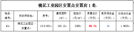 3、黃平縣槐花工業(yè)園區(qū)安置房1套,建筑面積:180.12㎡,起拍單價(jià):2260元/㎡,起拍總價(jià):40.71萬元;