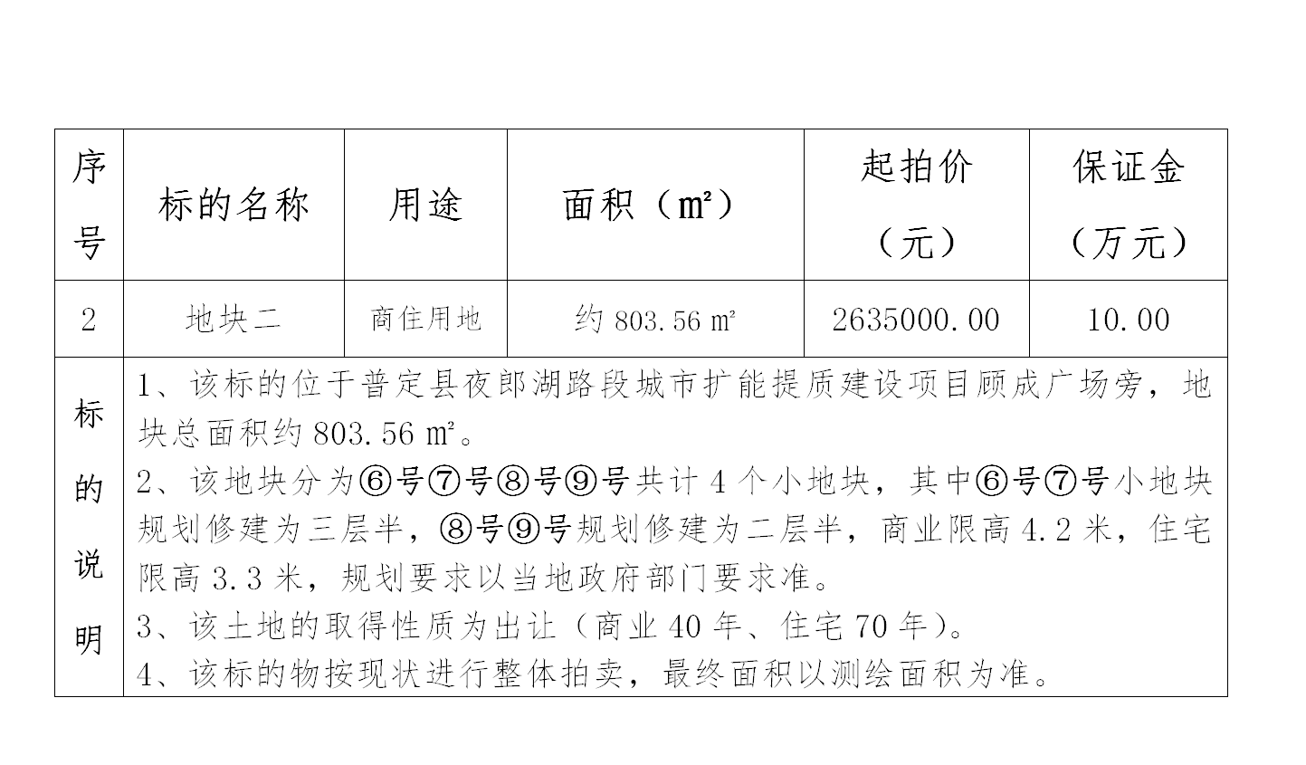 1、普定縣夜郎湖路段城市擴(kuò)能提質(zhì)建設(shè)項(xiàng)目沿線2宗國有土地使用權(quán),地塊一面積約1056.66㎡,地塊二面積約803.56㎡(其中地塊一分為5個(gè)小地塊、地塊二分為4個(gè)小地塊,土地用途為商住用地)。
