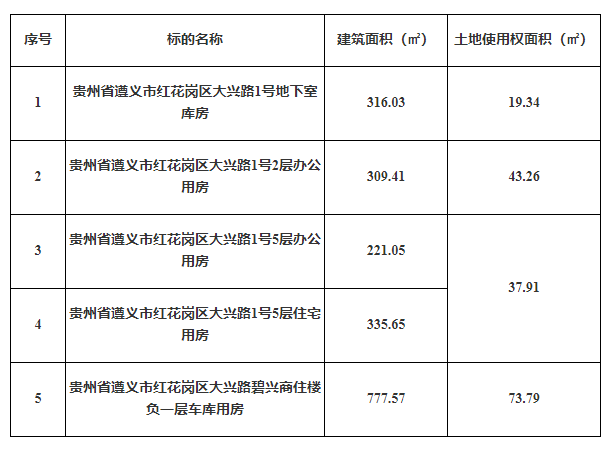 2、貴州省遵義市紅花崗區(qū)大興路1號地下室?guī)旆浚偨ㄖ娣e:316.03㎡);貴州省遵義市紅花崗區(qū)大興路1號2層辦公用房(總建筑面積:309.41㎡);貴州省遵義市紅花崗區(qū)大興路1號5層辦公用房(總建筑面積:221.05㎡);貴州省遵義市紅花崗區(qū)大興路1號5層住宅用房(總建筑面積:335.65㎡);貴州省遵義市紅花崗區(qū)大興路碧興商住樓負一層車庫用房(總建筑面積:777.57㎡)。